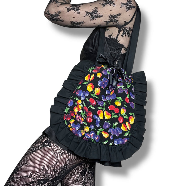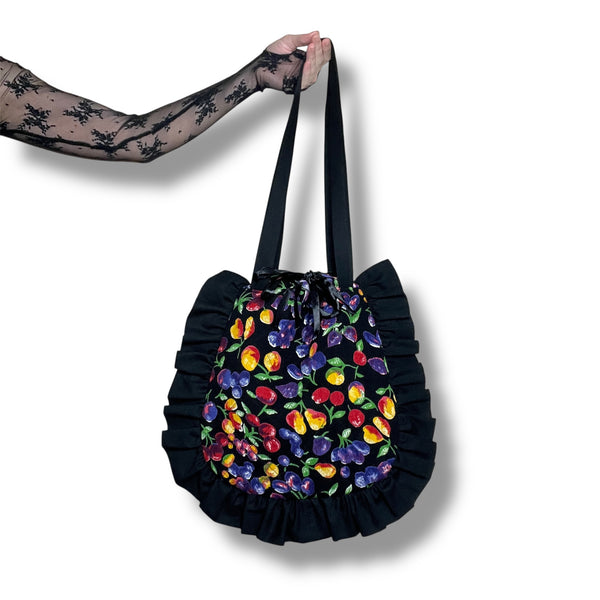 This bag has: a cute fruit print on a black background, black ruffle trim, quilted design, black lining, & drawstring closure with ribbons. Made with vintage fruit fabric.